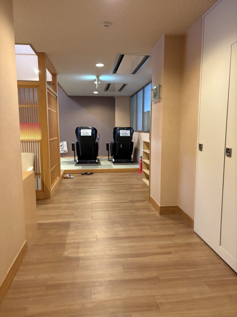 1階の受付裏には、ちょっとした休憩スペースがあり、マッサージチェアも設置されていました。