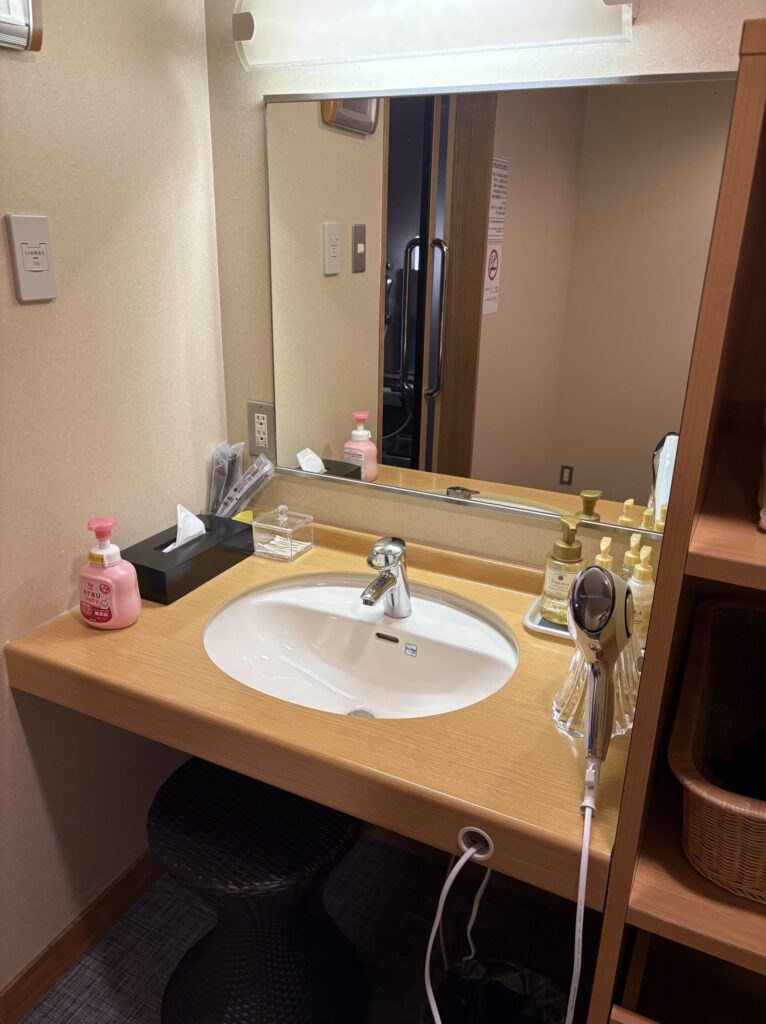 洗面スペースにはドライヤーのほか、化粧水・乳液・洗顔料などのアメニティも揃っています。