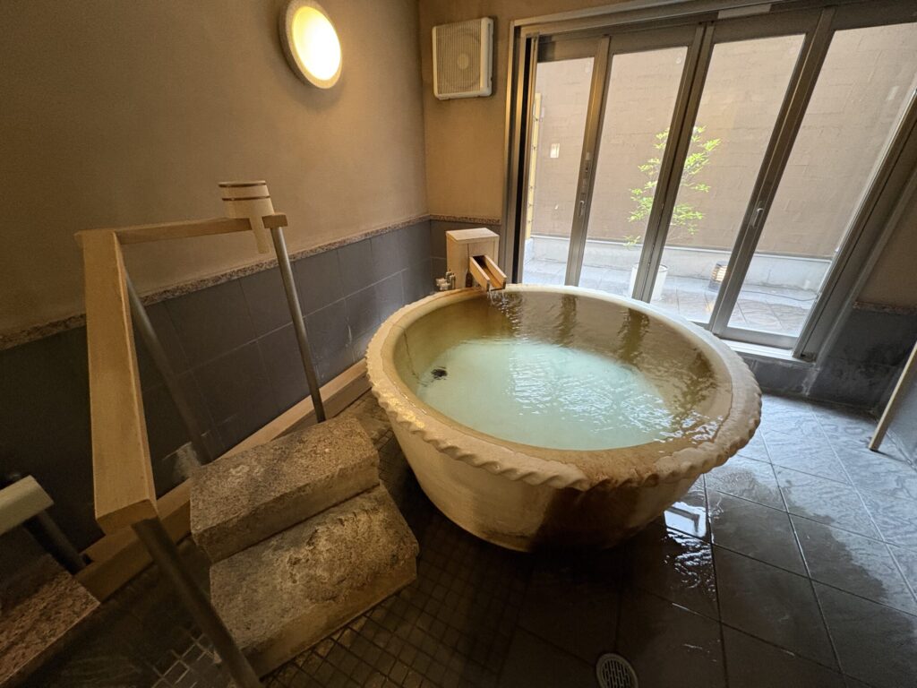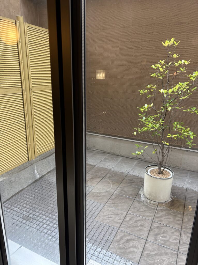 奥には中庭のようなスペースがあり、窓を開けると半露天風呂のようにして楽しむこともできます。気候の良い季節には特に気持ちよさそう。