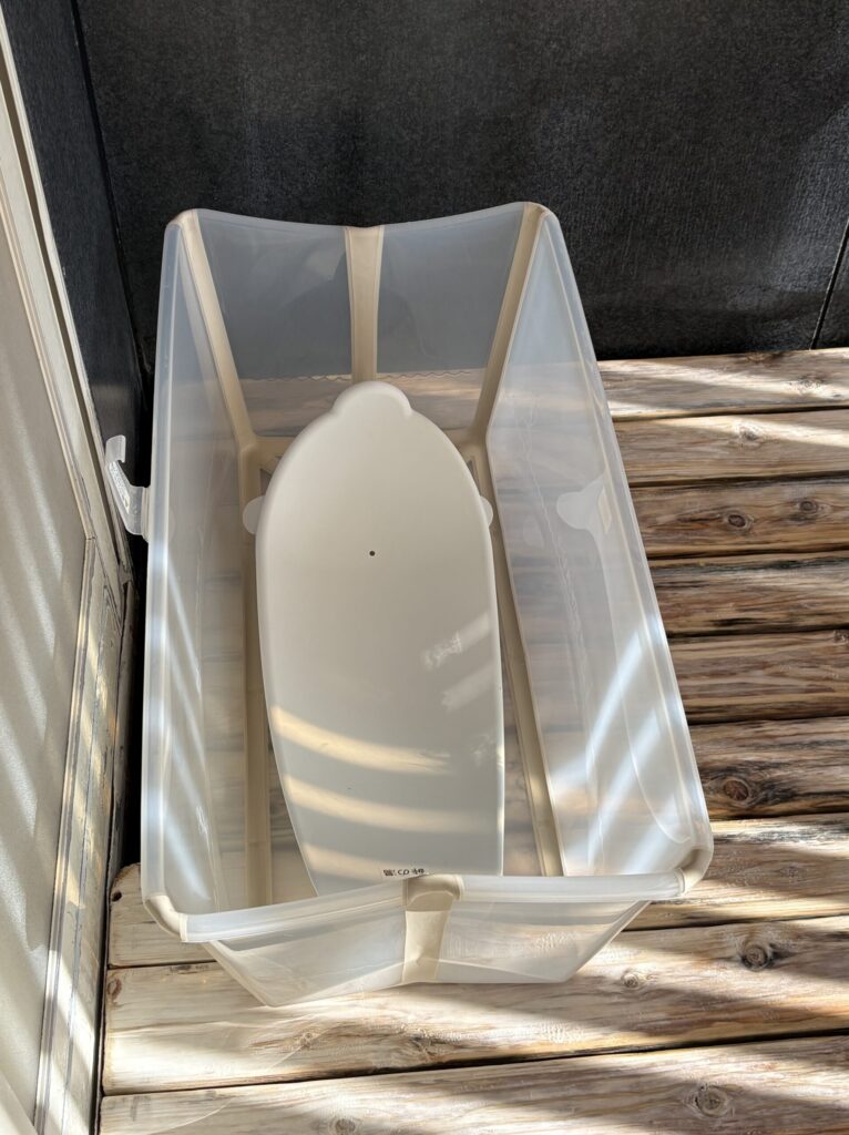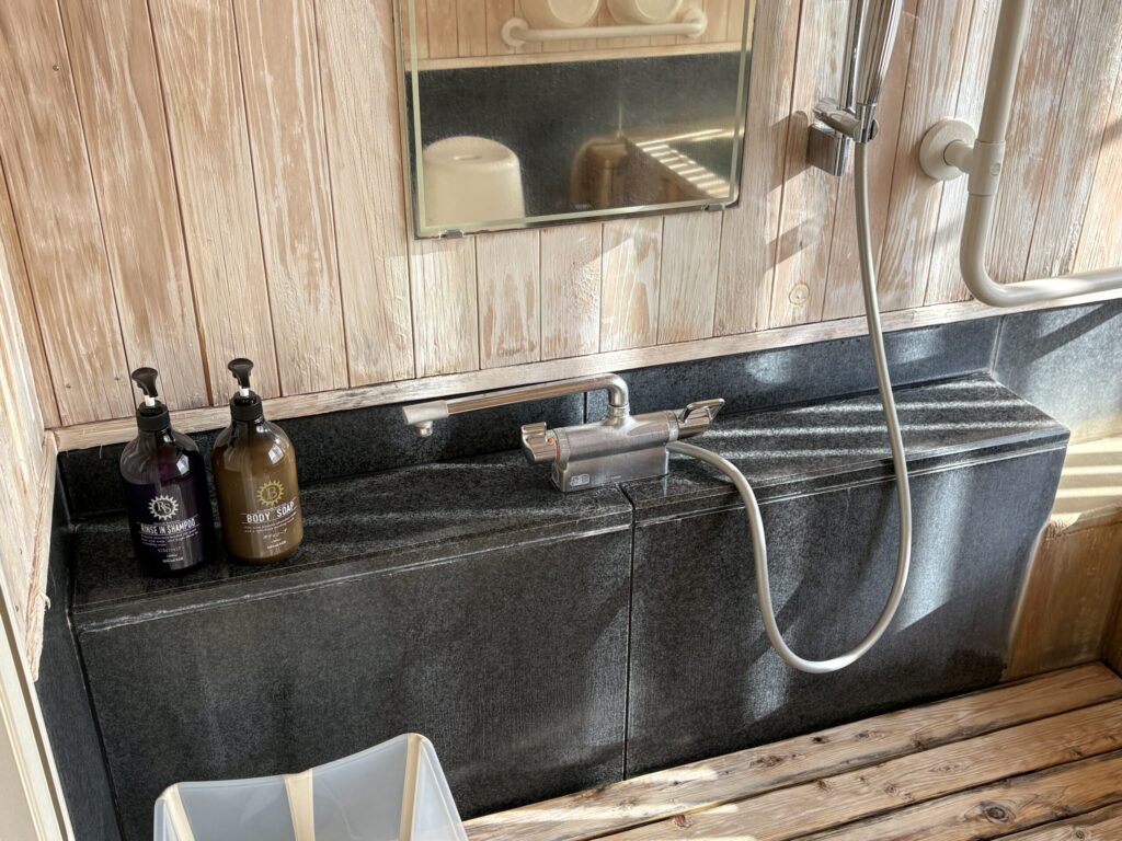 洗い場には、予約時にお願いしてあったベビーバスが設置されていました。下の子はさることながら、2歳の長男も気に入って、自分で温泉を汲んでお湯をためて「気持ちいいな~~」とひとりで入っておりました。