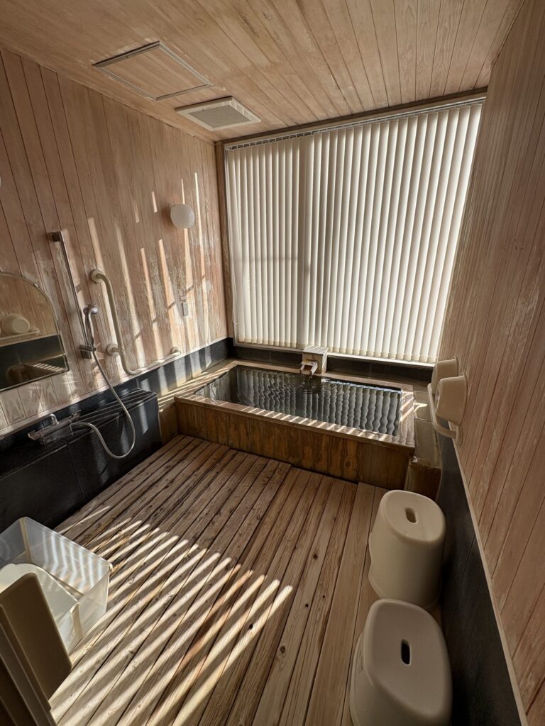 少し入っているだけでじんわりと身体が温まってきます。湯舟のふちに腰かけて外を眺めながらゆっくり温まるのが気持ち良いです。(その間、2歳の長男がちょろちょろ周りで遊んでいます)